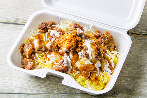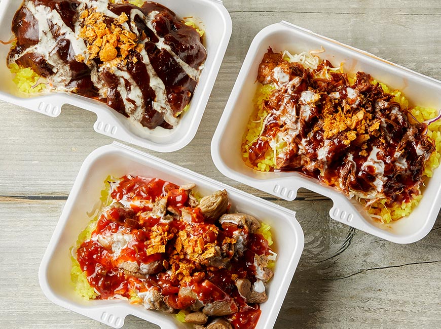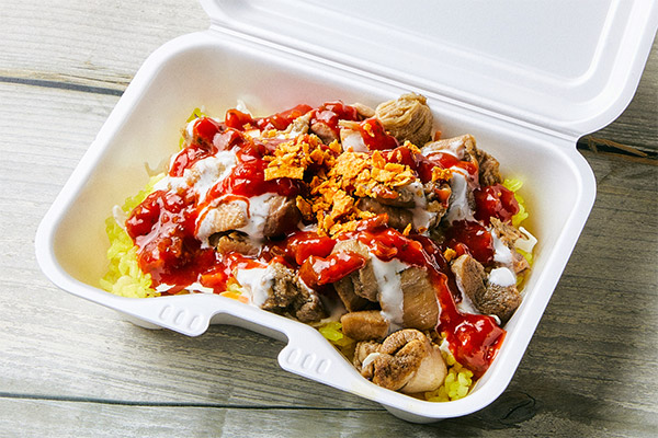 チキンオーバーライスとは、ライスの上に鶏肉とトマトやレタスなどの野菜をのせ、ヨーグルトベースのホワイトソースや唐辛子を使ったホットソースをかけた料理。アメリカ・ニューヨークの屋台では定番のメニューで、日本のどんぶりのようなワンプレートディッシュです。