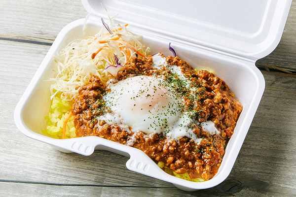 ターメリックライスに、独自で配合したハーブとスパイスで味付けした牛タンをホロホロにし、デミグラスソースと合わせ、ヨーグルトベースのホワイトソースをかけました。