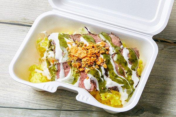 牛肉を赤ワインベースのマリネ液に漬け込み、低温調理したローストビーフをターメリックバターライスにのせて、ヨーグルトベースのホワイトソースと選んでもらったソースをかけます。